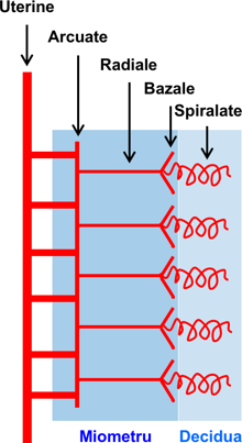 Principala sursa de vascularizatie a uterului este reprezentata de arterele uterine (stanga si dreapta) care se ramifica pentru a da nastere, in ordine: arterelor arcuate, radiale, bazale si spiralate.
