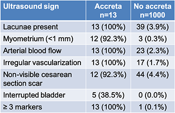 At least one marker was found in all cases of placenta accreta, in one third of cases of placenta previa and in about 10% of cases without placenta previa. The most common markers, found in both the cases of placenta accreta and those without were intraplacental lacunar spaces and non-visible cesarean section scar. At least three markers were found in all 13 cases of placenta accreta and in 1 of the 1000 cases without placenta accreta, giving a false positive rate of 0.1%.