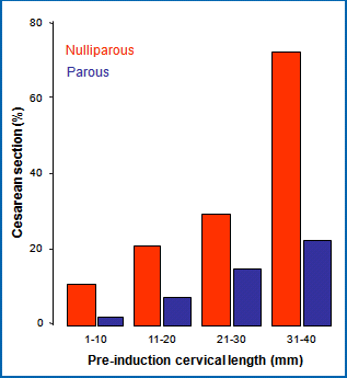 - У рожавших женщин частота Кесарева сечения из-за отсутствия родовой деятельности после индукции родов или дистресса плода увеличивается с 2% при «прединдукционной» длине шейки матки 1-10 мм до 20% при её длине более 30 мм