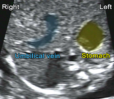 Obtain the 4-chamber view and maintaining a transverse section of the fetal trunk, angle or slide the transducer downwards to the abdomen, in order to image the stomach and situs
