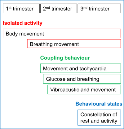 - Tercer trimestre: Se desarrollan estados de comportamiento regulados por el cerebro fetal. Los estados son diferentes periodos de sueño y vigilia que aumentan en duración conforme aumenta la edad gestacional. El sueño se caracteriza por falta de movimientos y disminución en la variabilidad de la frecuencia cardiaca fetal (FCF). En contraste con los momentos de vigilia que se caracterizan por movimientos fetales activos, comportamientos asociados y un patrón de FCF reactivo.