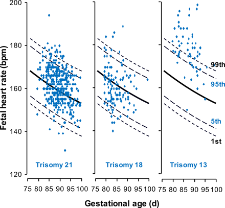 In trisomy 13 the FHR is substantially increased and is above the 95th centile in 85% of cases.