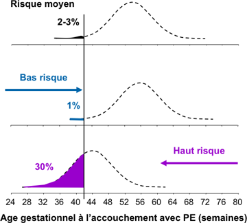 - Dans les grossesses à faible risque, la distribution de l’âge gestationnel est déplacée vers la droite. Par conséquent, la plupart des accouchements se dérouleront avant l’apparition de la PE.