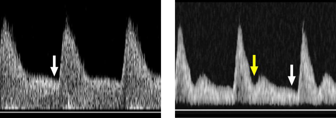 Profilo flussimetrico Doppler delle arterie uterine. L’immagine a sinistra mostra un’onda con abbondante flusso telediastolico (freccia bianca). L’immagine a destra mostra un’onda con alta resistenza al flusso con notch protodiastolico (freccia gialla) e ridotto flusso telediastolico (freccia bianca).