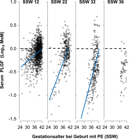 Bei Schwangeren die eine PE entwickeln, sind die PLGF Werte erniedrigt und die Abweichung der Werte von den MoM-Normalwerten für PLGF ist größer je früher aufgrund der PE entbunden werden muss. Folglich ist die Aussagekraft des Screenings für die frühe PE der der späten PE überlegen.