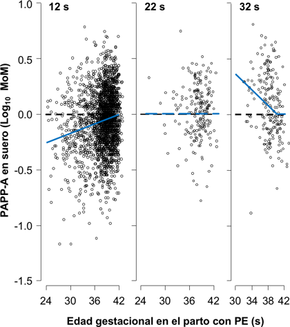 El alejamiento de los valores MoM de la normalidad es mayor en etapas tempranas del embarazo que en las tardías, en las que el parto es preciso debido a la PE. Por lo tanto, el rendimiento del cribado es mejor para la PE pretérmino que a término.