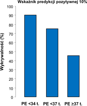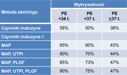 Złożony skrining na podstawie czynników matczynych, MAP, UTPI i PLGF wykryje około 90% przypadków bardzo wczesnej postaci PE (<34 tygodni), 75% przypadków postaci wczesnej PE (<37 tygodni) oraz 45% przypadków późnej postaci PE (≥37 tygodni); a wskaźnik predykcji pozytywnej wynosi 10%.