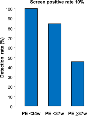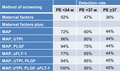 Combined screening by maternal factors, MAP, UTPI, PLGF and sFLT-1 predicts all cases of early PE (<34 weeks), at screen positive rate of 10%. Serum sFLT-1 improves the performance of screening for early-PE but not for PE at ≥34 weeks. Screening by maternal factors, MAP, UTPI and PLGF predicts 85% of preterm PE (<37 weeks) and 45% of term PE (≥37 weeks).